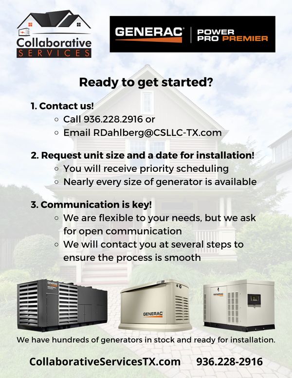 Contact us for our Generac Builders Alliance Program today, call 936.228.2916 or email HHudson@CSLLC-TX.com. Request the generator you need, set a date for installation, and we will handle the rest! We are flexible because we know that your projects will require it, which is why we assign an Account Manager to your project. Communication is key and we want to make the process smooth from start to finish.